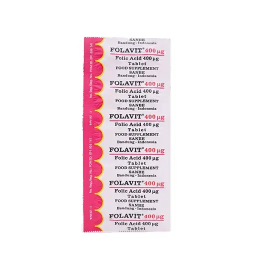 FOLAVIT 400 MCG adalah suplemen vitamin yang mengandung Asam Folat (Vitamin B9) dalam dosis harian yang dianjurkan. Informasi Umum Terkait Kandungan*: *Informasi ini bersifat edukatif dan tidak dimaksudkan sebagai klaim manfaat langsung dari produk. Asam Folat adalah nutrisi esensial yang berperan penting dalam berbagai fungsi tubuh. Zat ini dibutuhkan untuk proses pembentukan sel darah merah, sintesis DNA, serta pertumbuhan dan pembelahan sel. Asam Folat sangat penting untuk dikonsumsi sebelum dan selama masa kehamilan karena perannya dalam membantu mencegah cacat lahir pada tabung saraf (Neural Tube Defects/NTD) janin.